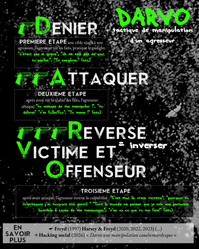 Si vous avez lu le dossier de Viciss sur le DARVO, vous reconnaissez sans doute le mouvement : Deny. Attack. Reverse victim and offender.